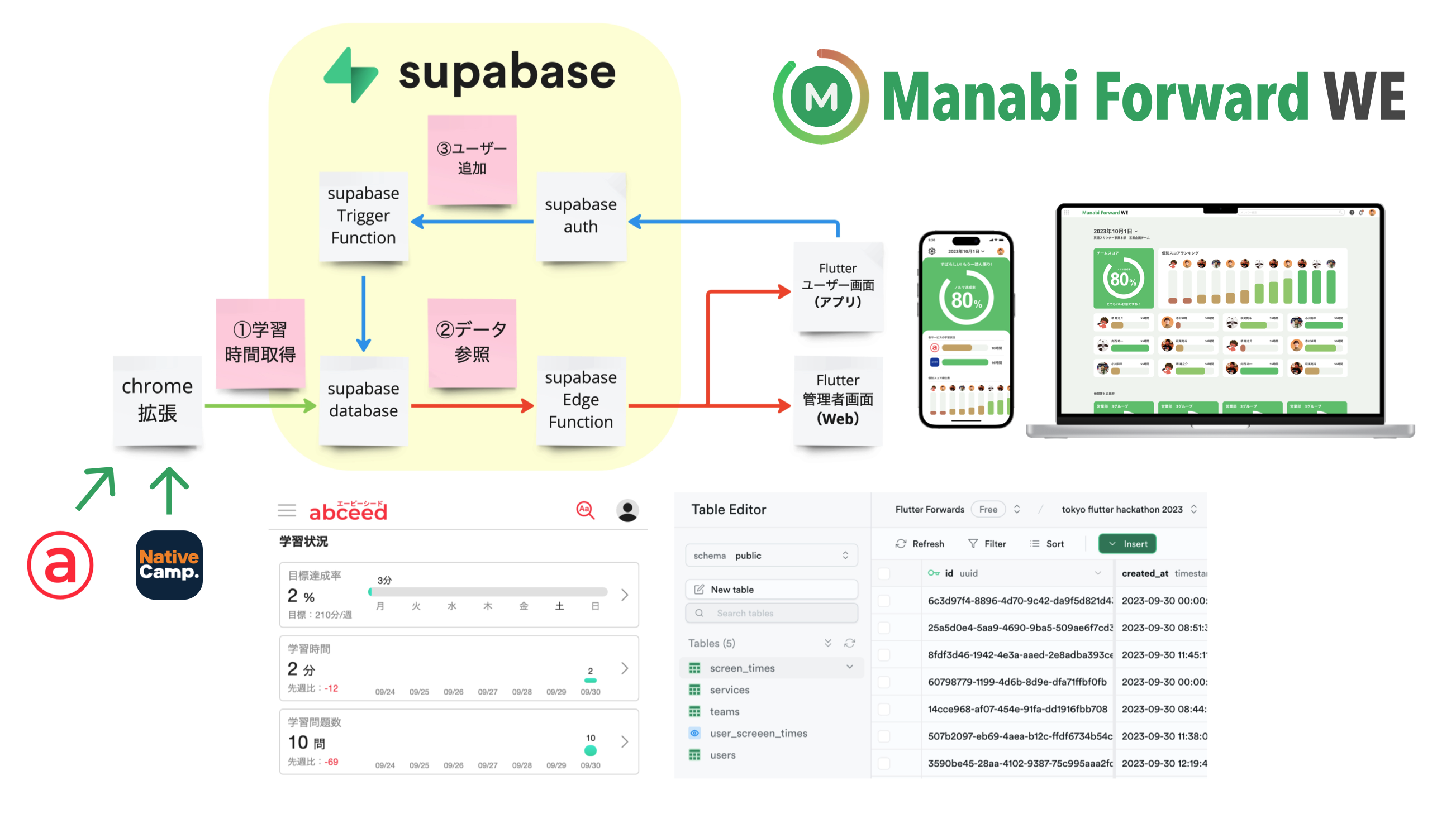 フロントエンドはFlutterを用いたモバイルアプリとFlutter Webによる管理画面。バックエンドとインフラは最近注目度が増しているBaaS「Supabase」を使いました。