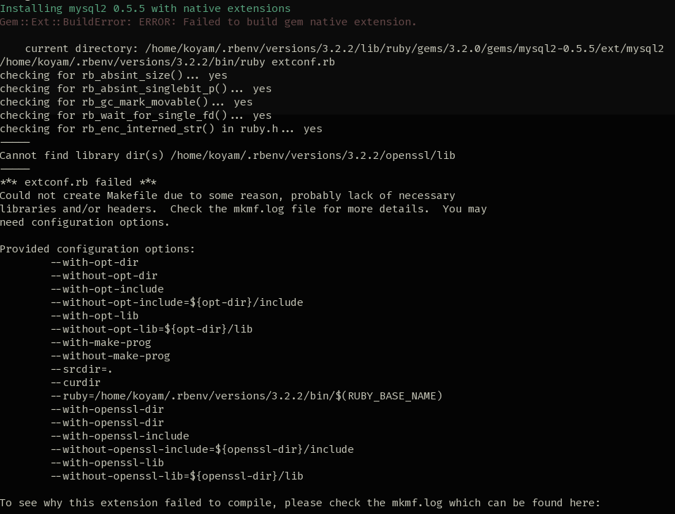 1つ目は libmysqlclient への依存です。mysql2 gem を build する際にエラーに遭遇した経験がある方も多いのではないでしょうか。