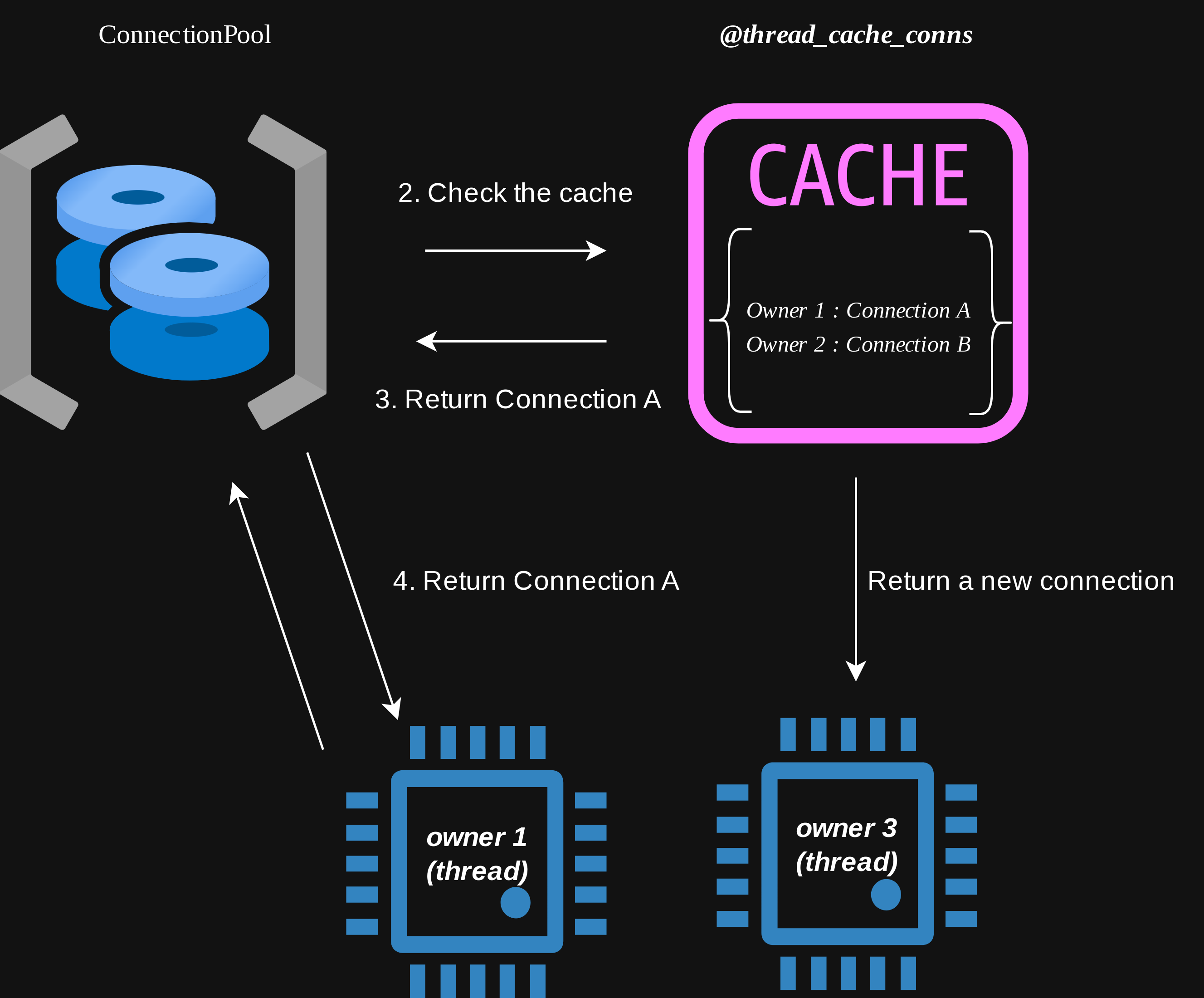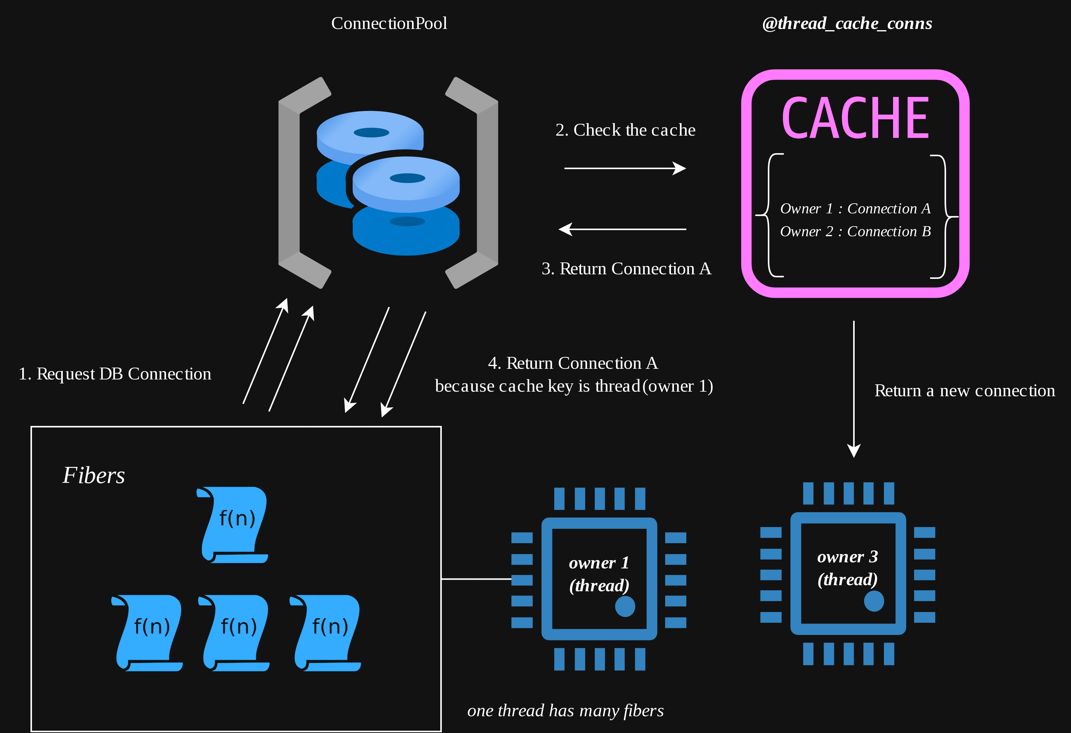 ここで 1Thread に対して複数存在できる Fiber が 同様に Connection Pool に問い合わせた場合、 DB Connection が Thread 単位で管理されているため、同じ DB Connection を取得することになります。