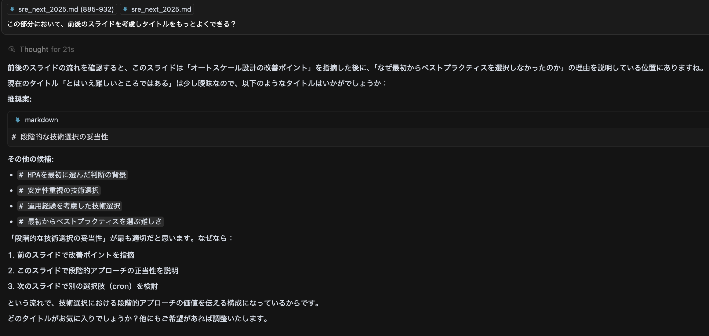 次にCursorです。CursorのChat機能でAIと対話しながらスライドを作成できるため、文章の添削やレイアウトの調整が非常にスムーズになりました。特に私が苦手としていたレイアウトやデザイン面での調整で非常に助かりました。 例として以下の点を教えてもらいました。
